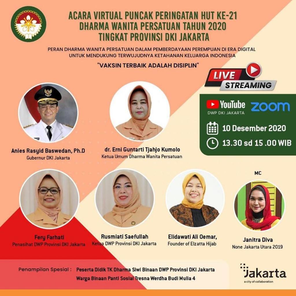 Sesuai dengan program kerja tahun 2020, DWP Provinsi DKI Jakarta telah menyelenggarakan acara puncak HUT ke – 21 Dharma Wanita Persatuan tahun 2020 secara virtual yang akan di hadiri oleh Gubernur, Wakil Gubernur, Ketua Umum DWP serta Penasihat DWP Provinsi DKI Jakarta.