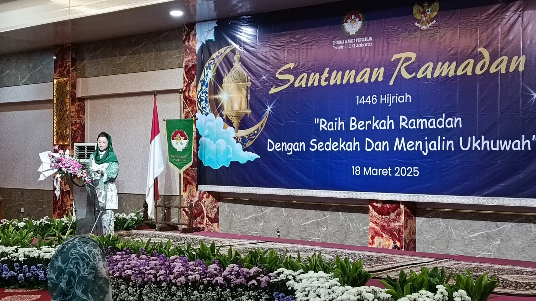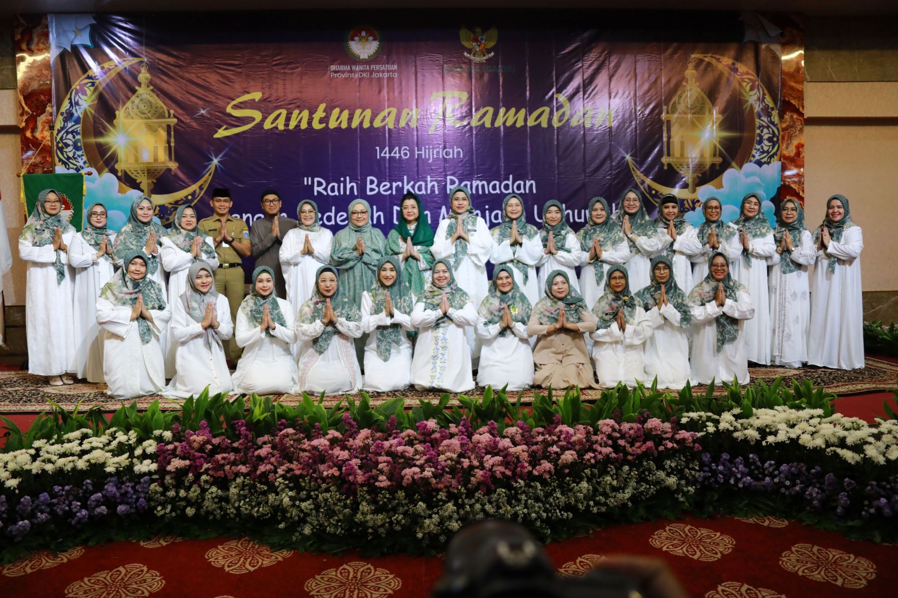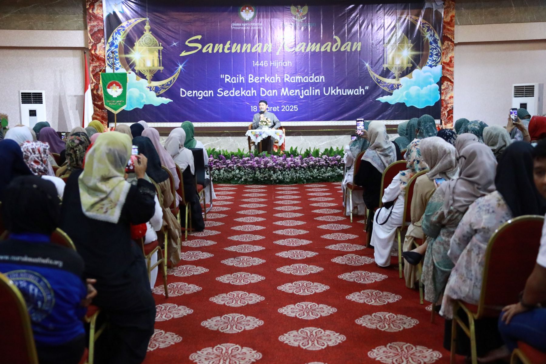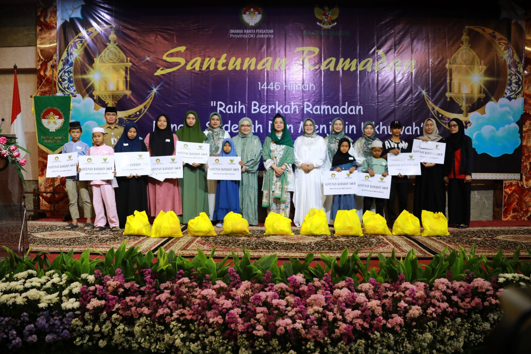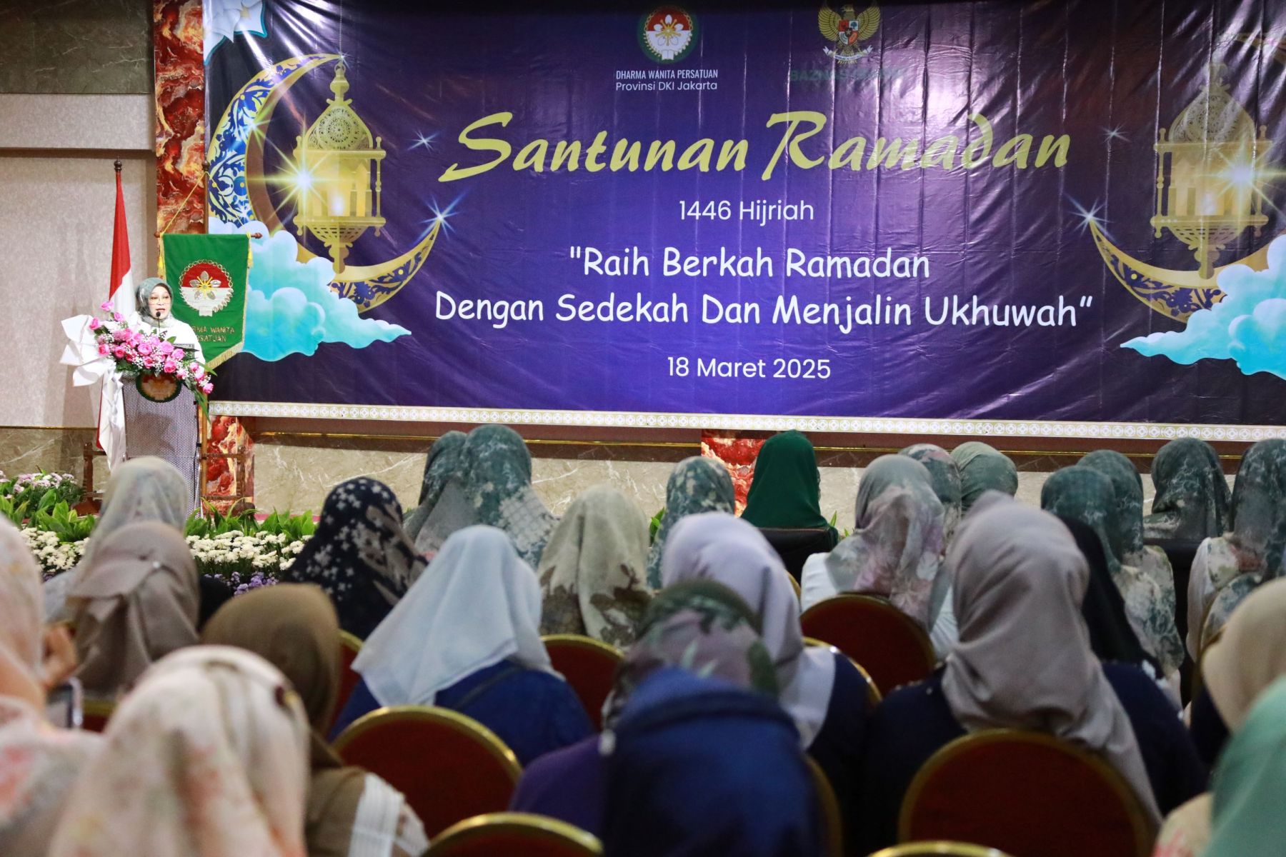 Selasa, 18 Maret 2025 Dharma Wanita Persatuan Provinsi DKI Jakarta bersama Baznas(Bazis) melaksanakan kegiatan santunan ramadan 1446 H. Bertempat di Aula Gedung Nyi Ageng Serang Kuningan Jakarta Selatan hadir Penasihat DWP Provinsi DKI Jakarta Ibu Hani Pramono dan Ibu Dewi Rano yang memberikan santunan berupa uang tunai dan paket sembako kepada 10 orang penerima sebagai perwakilan dari 646 orang yatim, janda, pensiunan, dhuafa dan PJLP. Kegiatan di isi dengan hadroh, pembacaan qalam ilahi dan tausiah oleh Ustadz Oemar Mita.