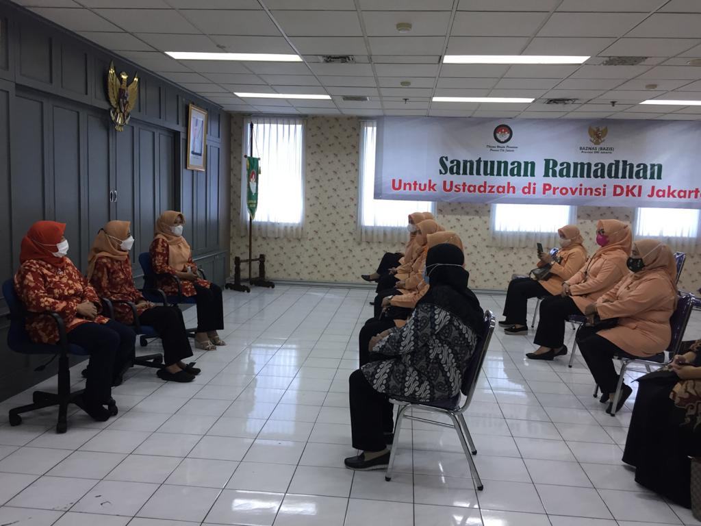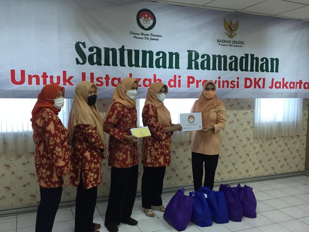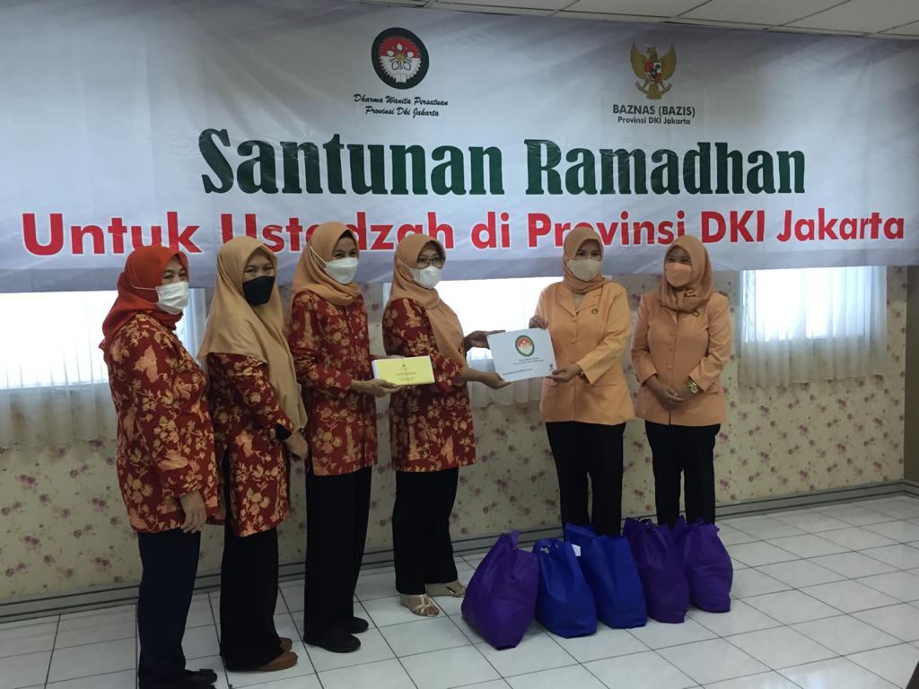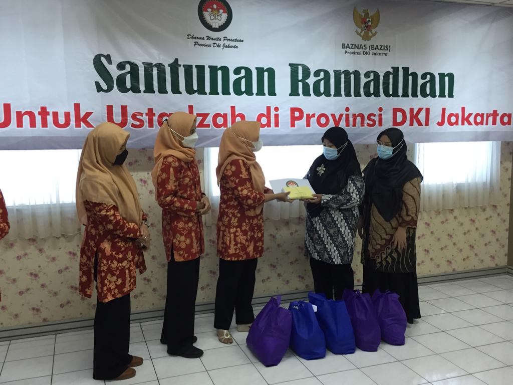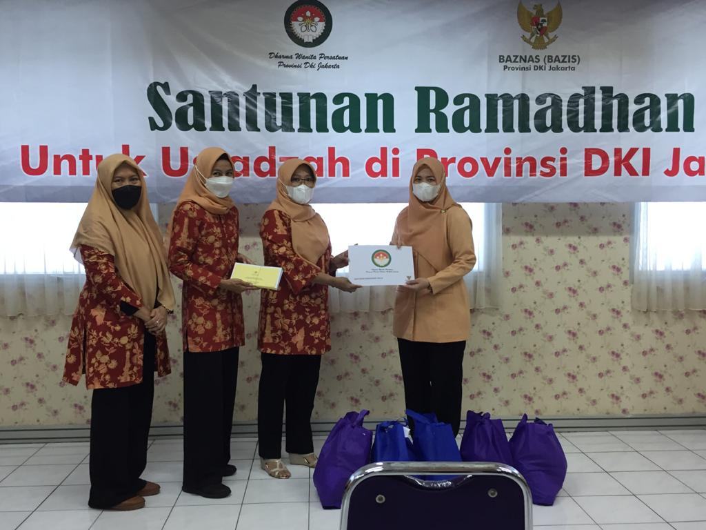 Selasa, 4 Mei 2021 Dharma Wanita Persatuan Provinsi DKI Jakarta memberikan Santunan Ramadhan untuk para ustadzah se – Provinsi DKI Jakarta, berupa uang Rp. 300.000,- dan paket sembako.